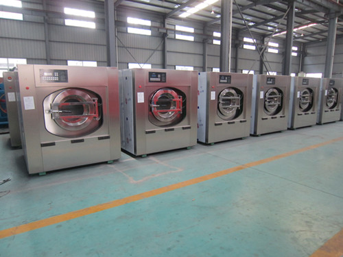 大型工業(yè)洗衣機廠生產(chǎn)的水洗機脫水筒的高速運轉(zhuǎn)產(chǎn)生離心力使含在織物中水分被甩出,便于織物晾曬,加速織物干燥。