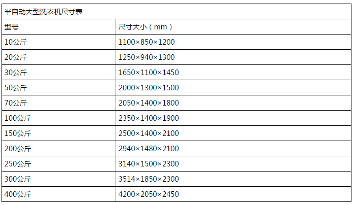 半自動(dòng)工業(yè)洗衣機(jī)尺寸大?。耗壳笆袌鲋械陌胱詣?dòng)工業(yè)洗衣機(jī),從容量10公斤至400公斤有多個(gè)規(guī)格,不同的容量,相應(yīng)的周身體積也是不同的。雖說不同的廠家在產(chǎn)品質(zhì)量、性能控制上略有差異,但產(chǎn)品的尺寸卻是大同小異的,下表就上海力凈為大家羅列出了10至400公斤不同容量的半自動(dòng)工業(yè)洗衣機(jī)的尺寸大小表。